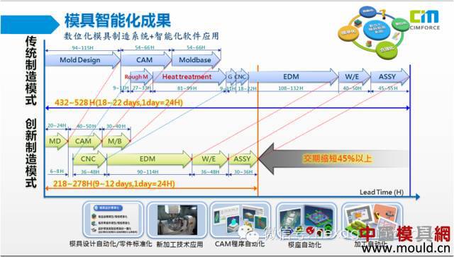 通过这套系统,我们将模具的制造时间从16天缩短为7天。这其中归功于我们的系统、加工设备技术的改变,来自海克斯康的测量设备以及牧野的机床设备,帮助我们的模具交期缩短45%,人员培训时间也大幅缩短,这是智能制造为我们带来的好处。