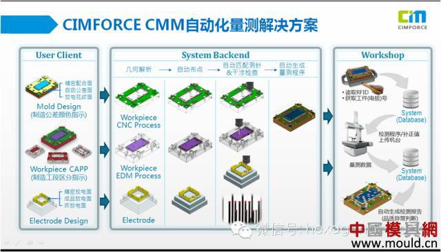 我们的系统,包括了线切割、数控电极程序、测量程序、EDM程序,全部实现了自动化。不需要人为介入,使用自动化的方法,采用几何识别功能,加上切削的逻辑库来实现这些功能,与人操作的结果差不多。如果将来加工一个电极的程序非常的便宜,就不需要再耗费人力,这样就对行业产生了改变。五轴加工的模拟,以前也是通过人来操作的,现在可以利用云端的平台在后台进行操作,这样就改变了整个工业环境的模式。