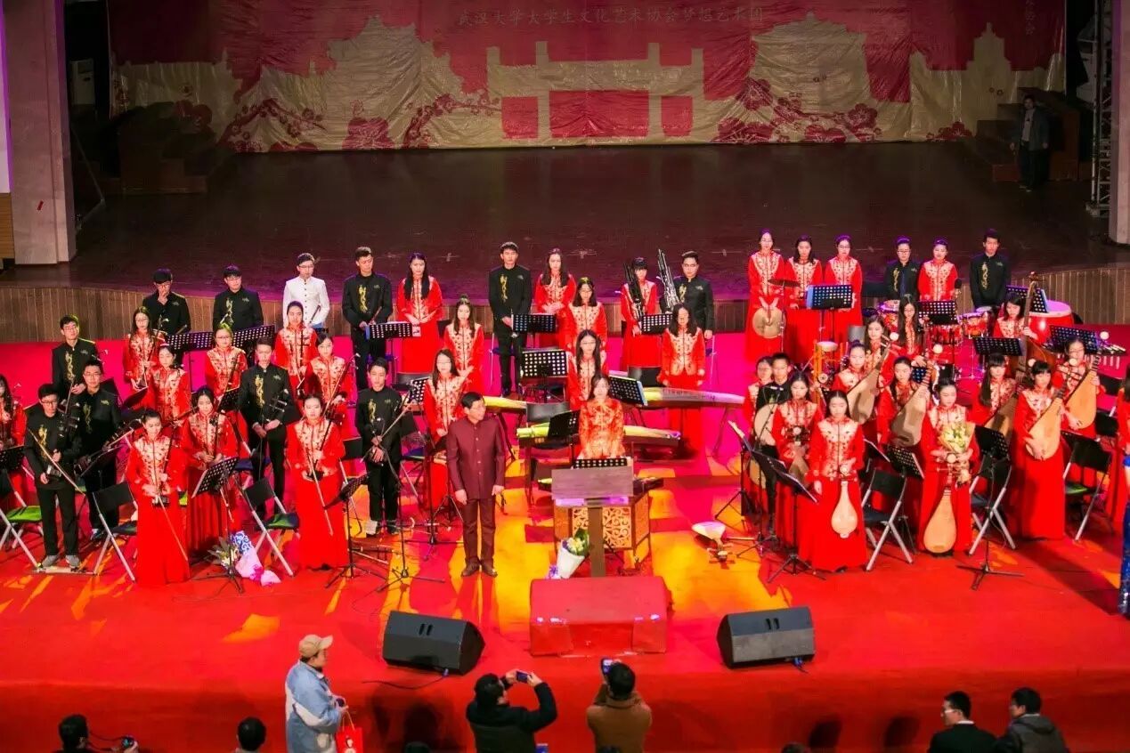 没错,这就是武汉大学的民乐团,洋溢着喜庆与欢腾,复古气息中不脱青春活力,一身古典气质的才子佳人们,用他们温润的指尖传达着——一生一世爱着你,民乐。