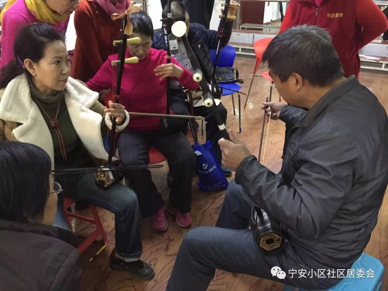 上课前社区居委会和社工积极精心准备场地器乐,耿老师为每一位学员调试好二胡的音调,大家在耿老师的耐心指导下从基础教起,坐姿、手型等,社团的成员们虽然年龄大了,但热情很高,老师认真的教,学员们虚心的学,今天虽然是入冬以来最冷的一天,气温达到0度以下,但学员们都认真拉着每一个音符,老师也手把手纠正每个学员的动作,现场学习气氛高涨。