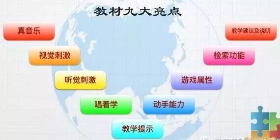 教材九大亮点:真音乐、视觉刺激、听觉刺激、唱着学、动手能力、游戏属性、检索功能、教学提示、教学建议及说明。为了让教材内容更具有音乐表现性“音乐版”教材使用大量中外著名古典音乐、儿童歌曲、电影音乐、以及近现代风格音乐片段,并全部配有音乐家现场演奏或录制的音响,旨在让学生最初接触和学习音乐基础知识的同时,感受丰富的音乐体验。学生首先对音乐有一个完整的认识,之后再逐步深入学习音乐的具体知识。