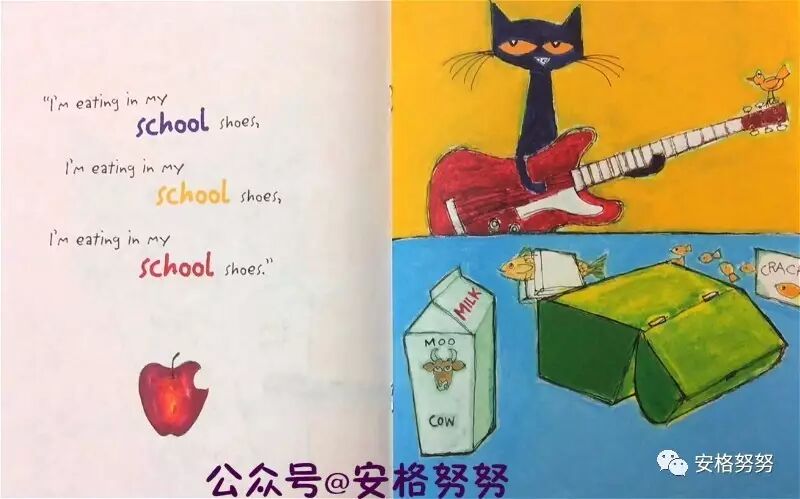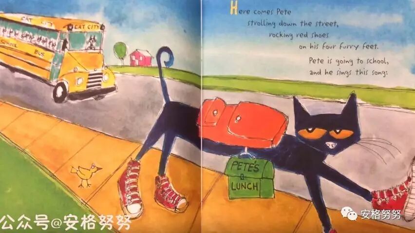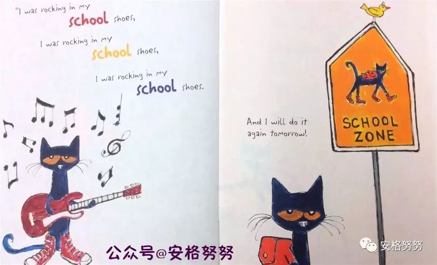 本次的绘本《Pete the Cat-Rocking in My School Shoes 皮特猫-穿着学校鞋子去摇滚》讲的是皮特猫去新学校的故事。我猜不少孩子9月份都要去幼儿园、或者读小学了吧。我家老二9月份也要升小学了,老三也要换幼儿园了。所以特意选了这样一个故事,给即将升学换陌生环境的孩子做准备。