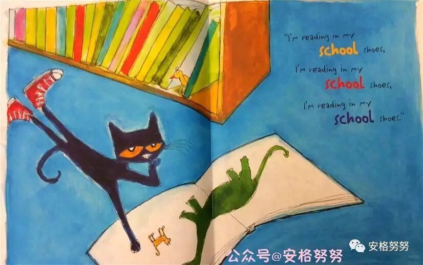 这个绘本延续了皮特猫系列故事喜欢用动名词的习惯。例如:I'm rocking... I'm reading...