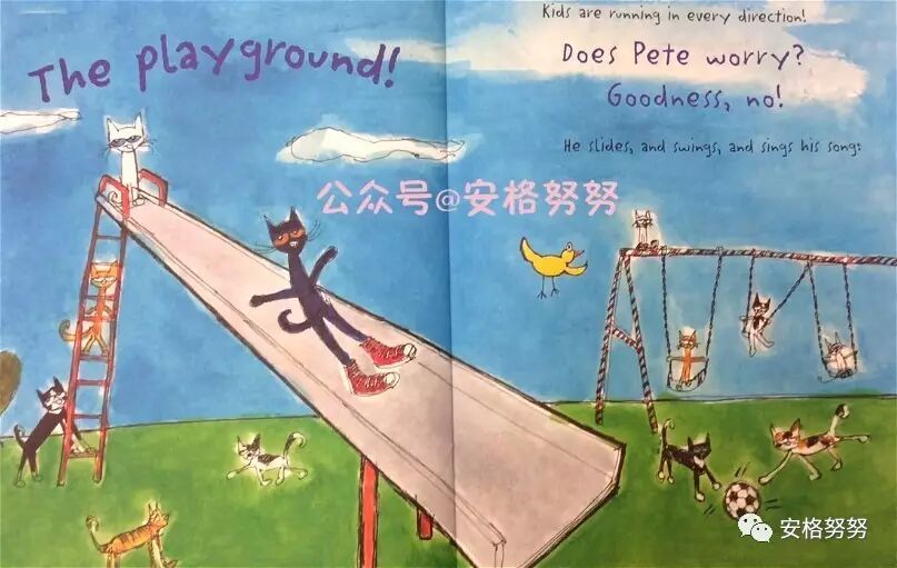皮特紧张吗?不!他滑滑梯、荡秋千、唱他的歌: