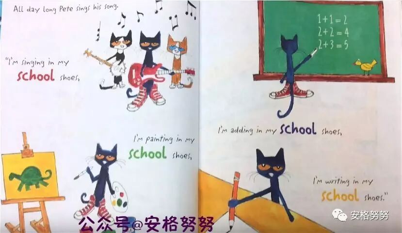 一整天,皮特唱着他的歌。“我穿着学校的鞋唱歌,我穿着学校的鞋画画,我穿着学校的鞋算加法,我穿着学校的鞋写字。”