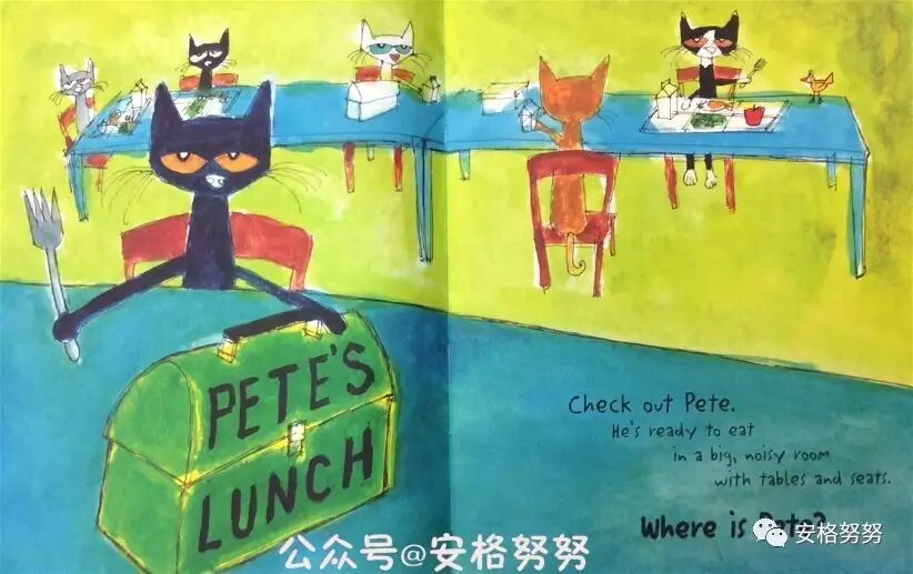 看看皮特。他在一个又大又嘈杂、有桌子和椅子的房间里,准备吃东西。皮特在哪里?