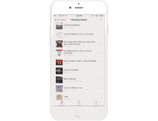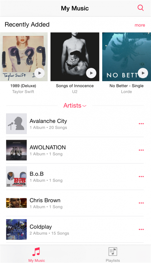 最近添加的专辑和播放列表会出现在歌曲库的顶部,让你很容易就找到要播放的内容,轻点插图就可以听歌。