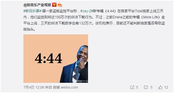 今年6月30日,美国hip-hop天王Jay-Z发行自己的专辑《4:44》,这张专辑首先在自己的流媒体音乐平台Tidal独家上线3天。根据一家反盗版监控平台表示,在这3天内,他们监控到将近100万次的非法下载行为。