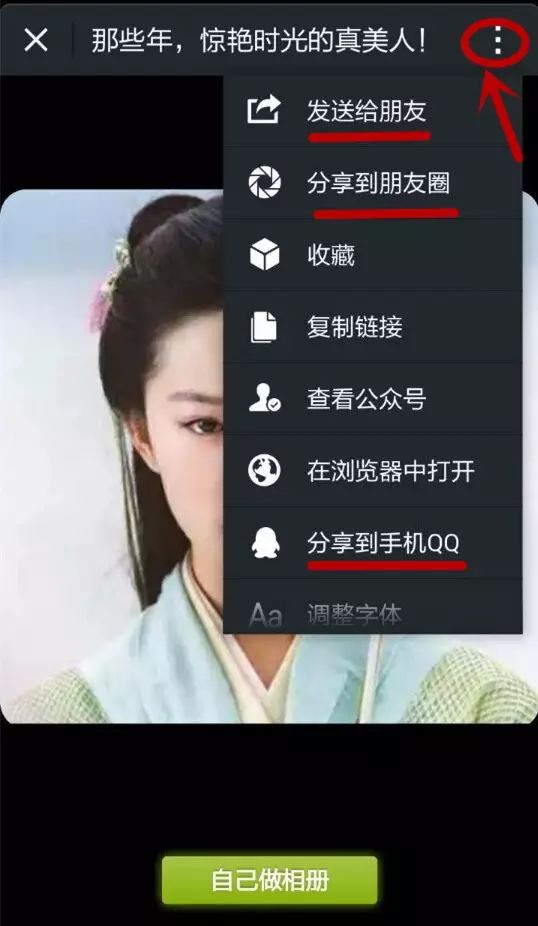 点击页面右上角的三个小圆点(如下图中红色箭头指示),即可发送给朋友或分享到朋友圈。