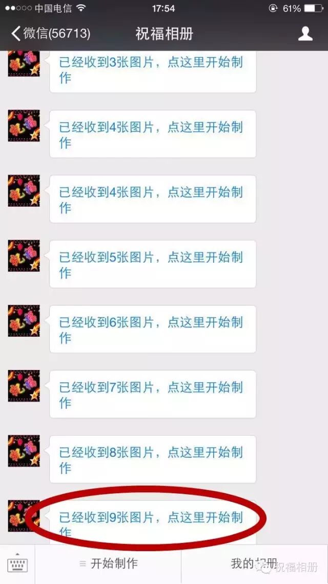 所有照片发送完毕后,点击最下面一行蓝色小字。即可生成相册。