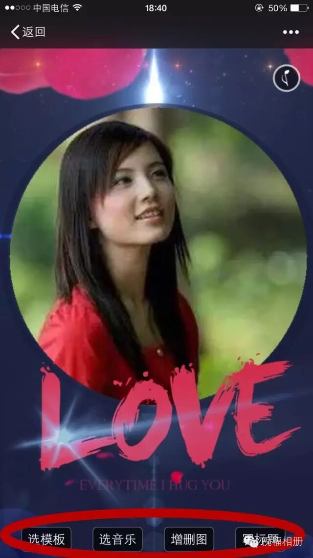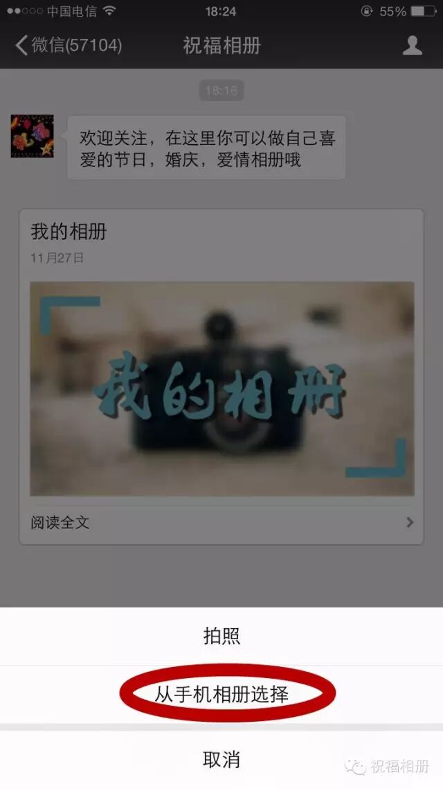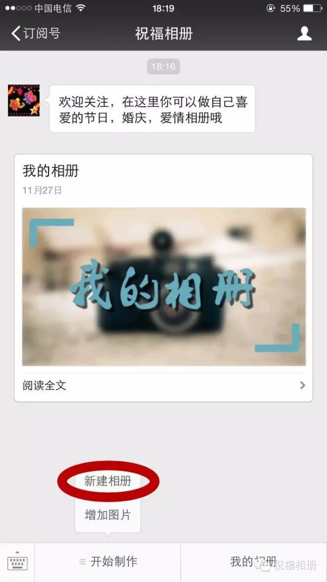 进入【祝福相册】公众号,看到最下面一行菜单。