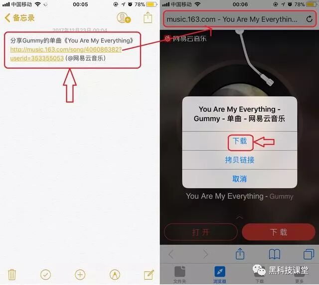然后这个时候注意了,因为网易云复制链接带有中文,大家可以看到图片上的备忘录截图,只需要把黄色字体的链接复制粘贴到软件 Browser 的浏览器中地址栏,就会跳出如图所示的下载按钮,这时候点击下载即可下载这首付费歌曲了。