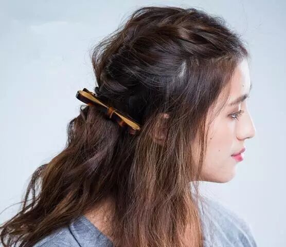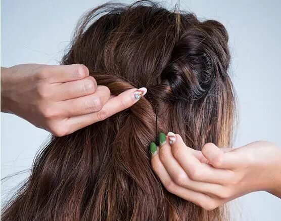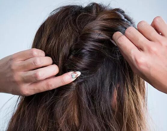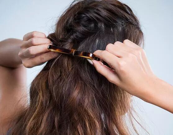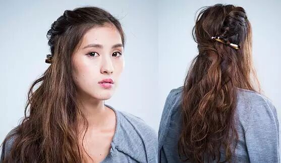 STEP3:左右两边的头发在靠右的方向会合,用发卡固定。