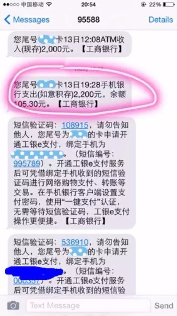 对方接着问「我是拍拍网旗下的一个网游公司(名字我没有听清),你是不是在我们这里买了2200元的游戏点券?」。我否认,就在这时,我的手机接到工行95588发的一条短信,说我的银行卡支出了2200元,就是下面画圈的那一条。