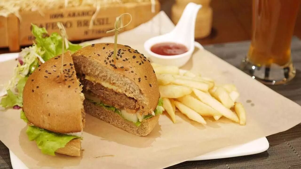 松软的全麦面包烘烤出一个完美的弧度,面皮颜色棕黄诱人,撒上的一层黑芝麻更添香脆,轻轻切开汉堡,饱满的肉汁顺着切口缓缓流淌下来。
