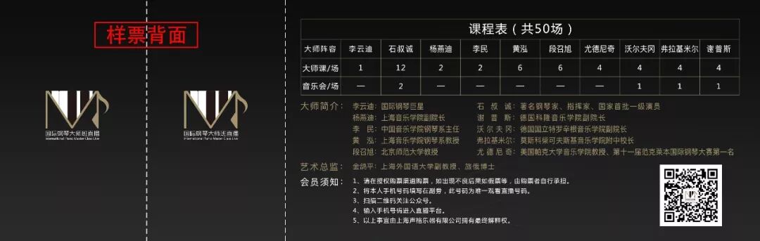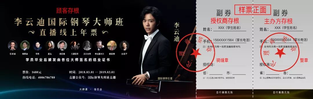 1、请在正规授权购票渠道购票(注:李云迪国际钢琴大师班直播线上年票只有实体票出售,无电子票、兑换码等其他形式票),如出现不良后果如假票等,由购票者自行承担。
