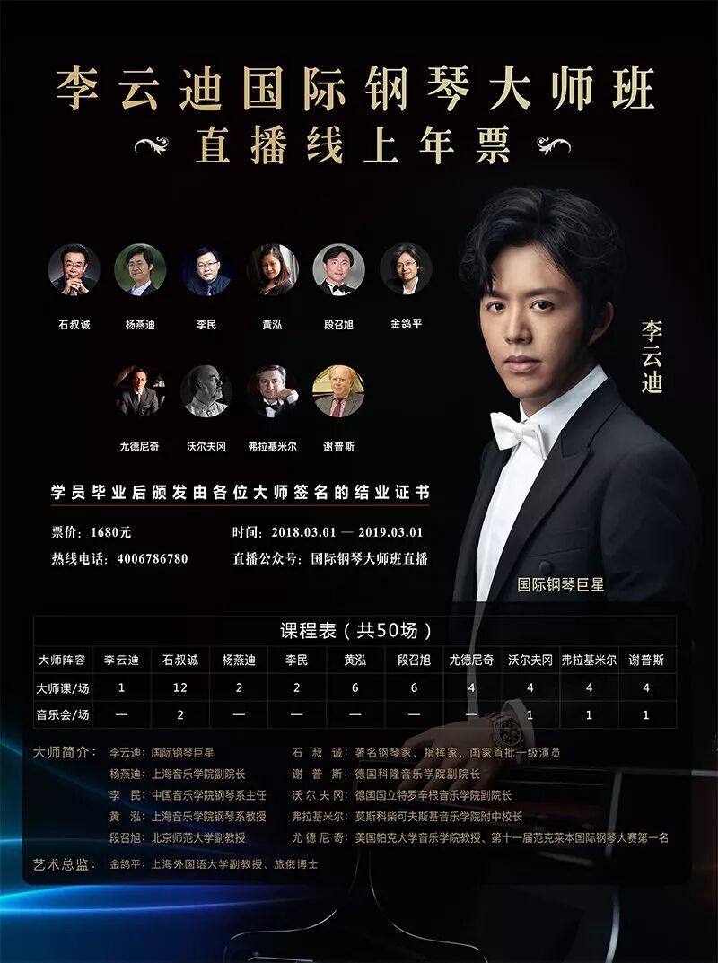 本次直播邀请到国际巨星李云迪及国内外钢琴大师共十位。包含大师课、音乐会、亲子课堂共50场,学员结业后颁发由李云迪等全部大师签名的结业证书,期待您与李云迪在线上互动。