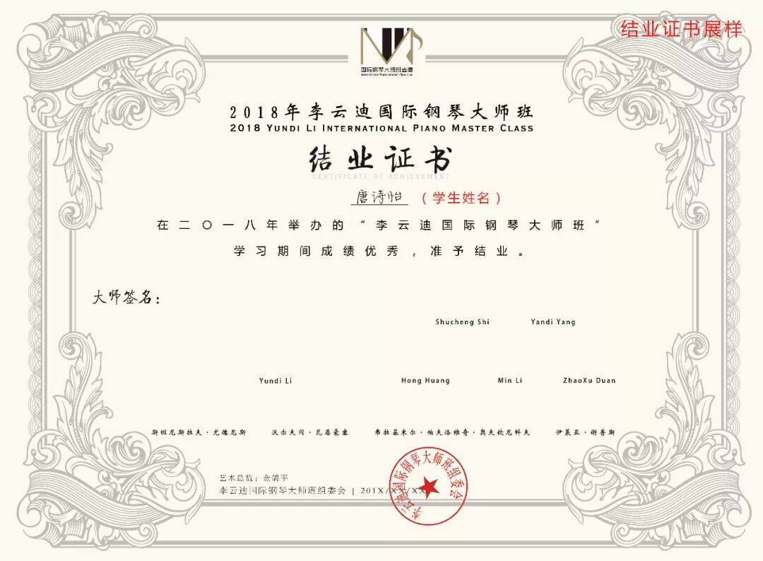 • 学员结业后颁发由国际钢琴巨星李云迪等全部大师签名的结业证书