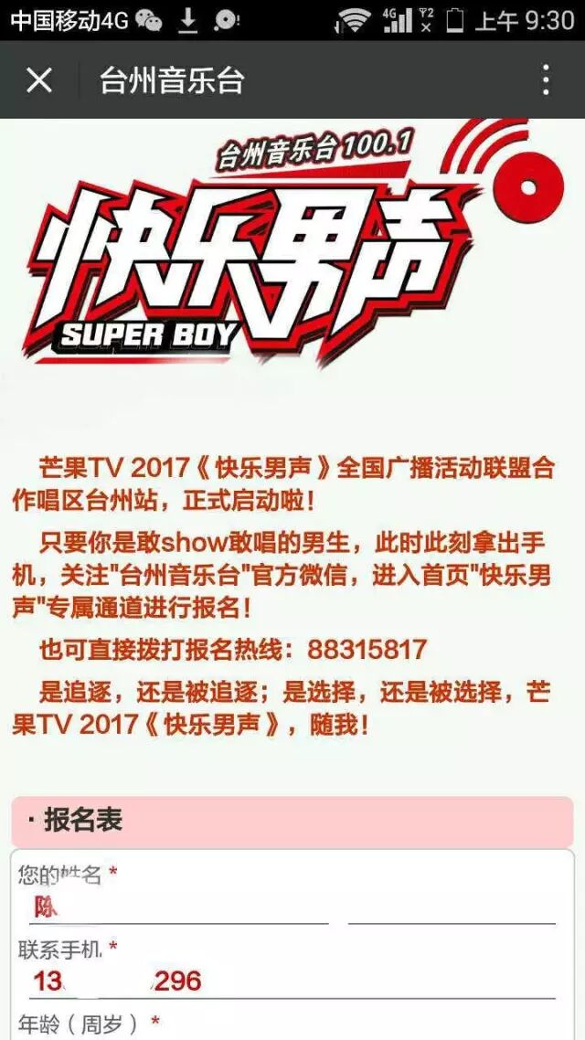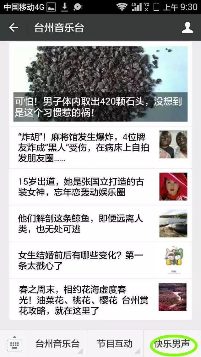 1进入“台州音乐台”(tzyyt1001)官方微信,下拉找到“快乐男声”