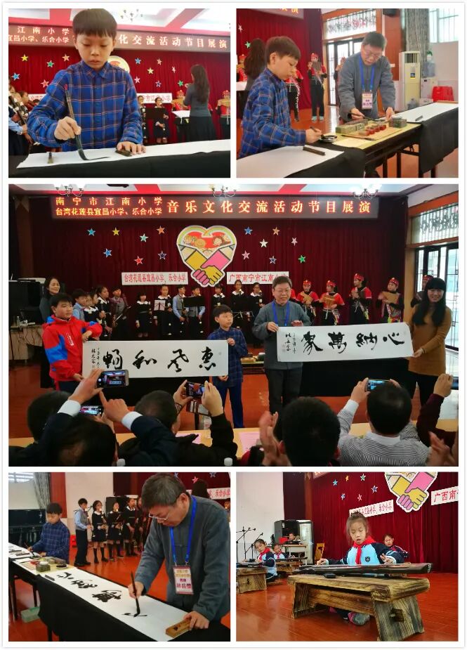 期间更有台湾书法大家林岳莹老师在《风中奇缘》的伴奏下与儿子现场挥毫书法,在优美的音乐声中,他们留下了《心納万象》和《惠风和畅》两幅佳作并现场赠送给江南小学。