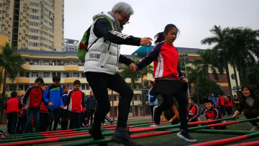 台湾小朋友兴趣高涨,纷纷参与了跳竹竿、抛绣球、三人足和滚铁环等民族体育体验活动。