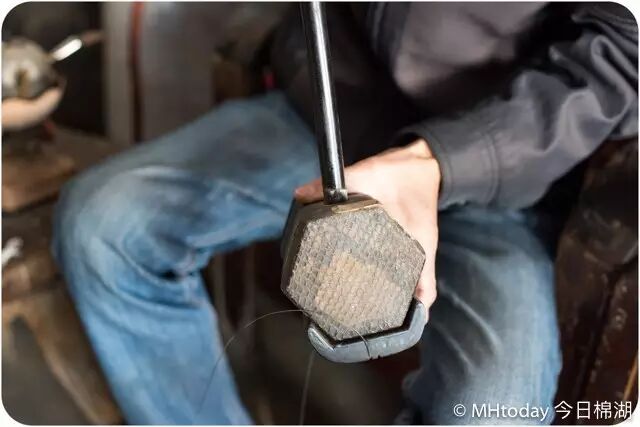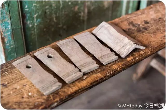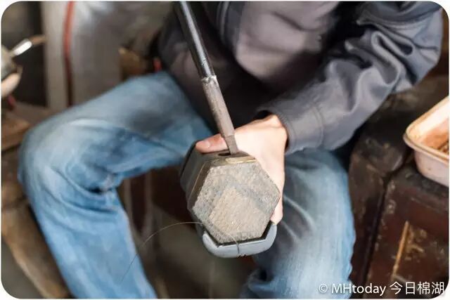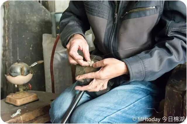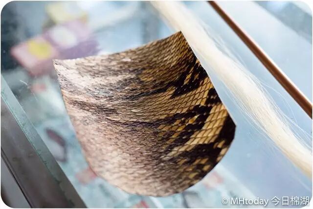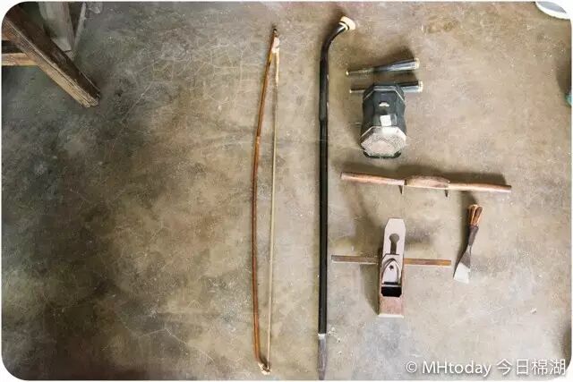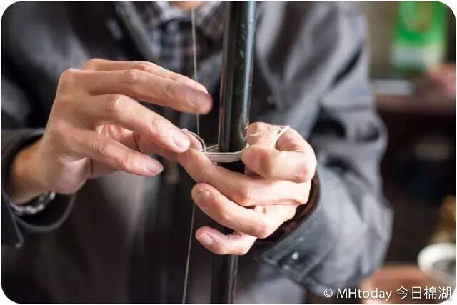 二胡的构造看起来虽然简单,当时其制作工艺去让十分繁复,锯木、刨形、画线、钻孔、拼装、上弦、涂漆、调音……每一个步骤都是一项精细的手工活。一把完整的二胡,包括琴筒、琴皮、琴弦、琴杆、琴弓等不同部件,刘师傅现场向我们展示了二胡的组装过程,只见他将琴杆插入琴筒里,把粗的一根弦也就是里弦的孔扣在琴托的左钉上,弦的另一头插入上面的琴轴上顺时针转动琴轴,使弦有一定的张度,再把细弦,孔扣在琴托的右钉上,把弓子弓毛向左,弦从下往上穿入弓子,细弦另一头插入下琴轴,逆时针转动下轴,使其张紧,再用棉线,离下轴10公分左右,在琴杆与琴弦上绕几圈,这就是二胡中的千斤,最后把琴马放在琴弦与琴皮之间,这样一般完整的二胡就制作完成了。