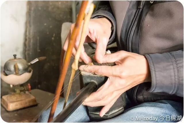 刘师傅的制作工艺十分娴熟,小编看着十分容易,但是其背后的辛苦却是不为人知的。兴之所至时,刘师傅便为我们演奏了一曲动听的潮州乐曲,他一手按弦,一手运弓,优美的曲调从指缝间流淌,这动人的悠扬瞬间为枯燥的制作过程增添了一丝诗意。