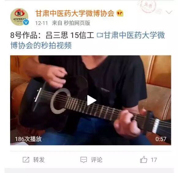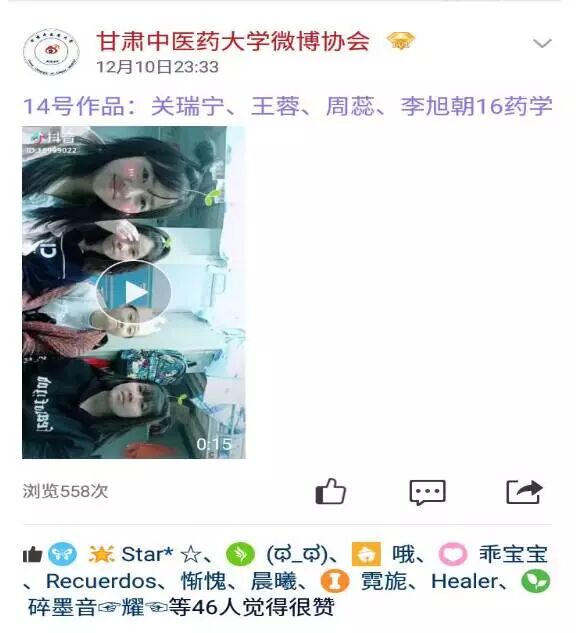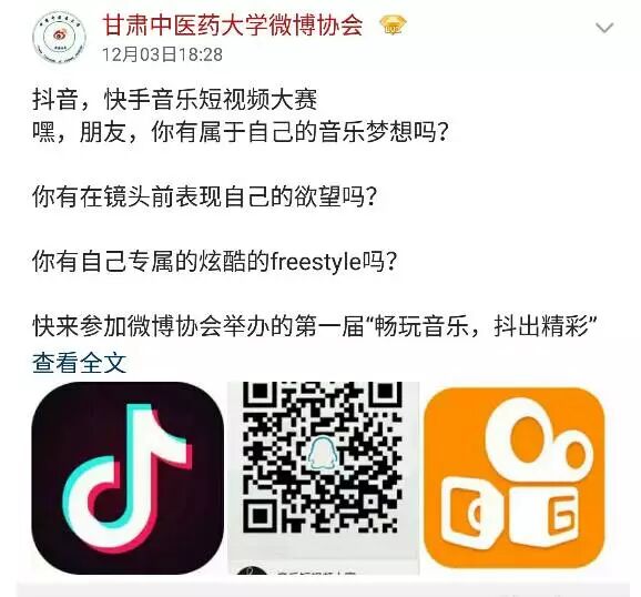 2017年12月16日,由甘肃中医药大学学生社团联合会主办,微博协会承办的以“畅玩音乐,抖出精彩”为主题的音乐短视频大赛正式结束。本次活动分前期宣传、作品收集、选手拉票、后期整理四个环节,整个活动采取网上投票的方式进行。在报名工作结束后,选手进行作品的拍摄,并在规定时间内上交给工作人员,再由工作人员分别上传至协会的官方微博和官方QQ,以点赞的方式进行作品投票。
