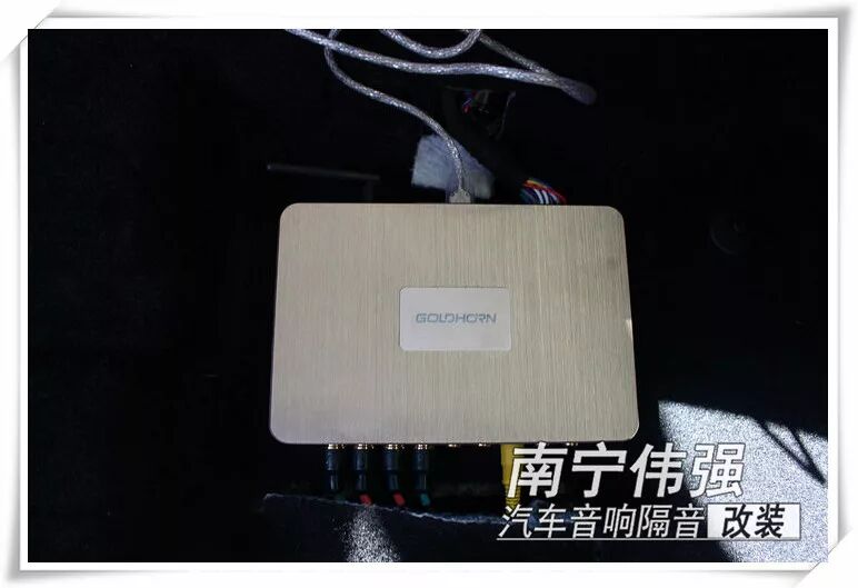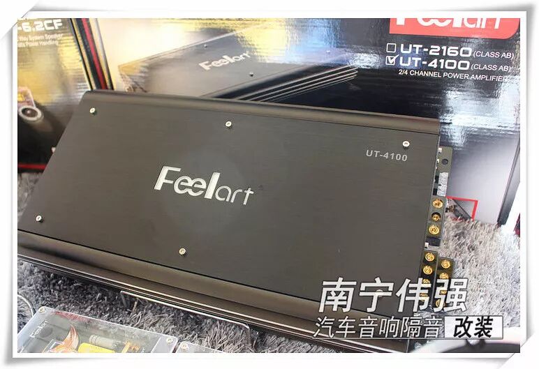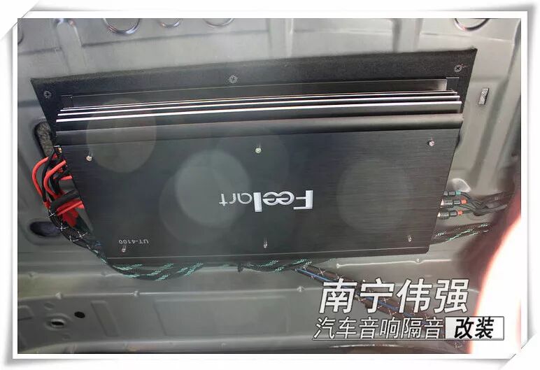 功放则用芬朗乌托邦系列UT-4100,共有4路功率放大电路,2路功率放大电路为1组,2组功率放大电路呈对称结构,并设有合理而全面的功能和4路100w的强大功率以此保证音响功率的输出与声音的稳定流畅。芬朗UT-4100四路功放选择在后尾箱上进行固定连接安装。