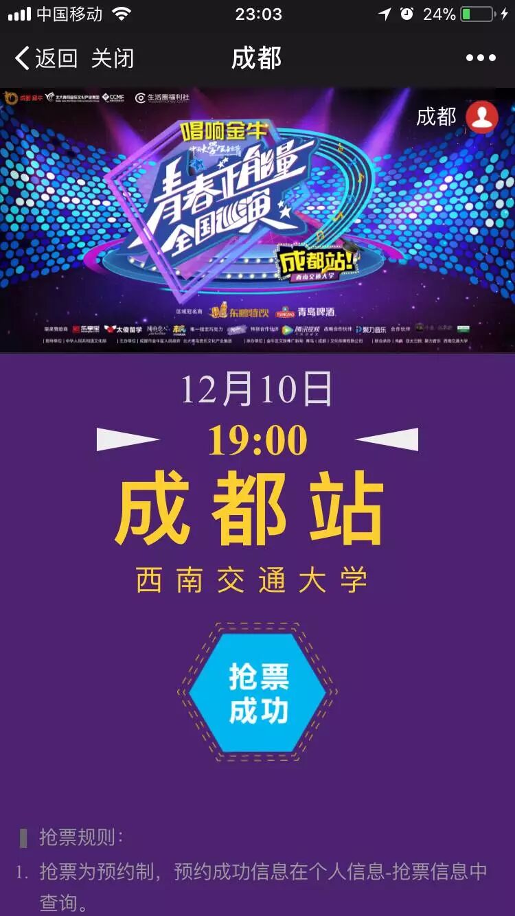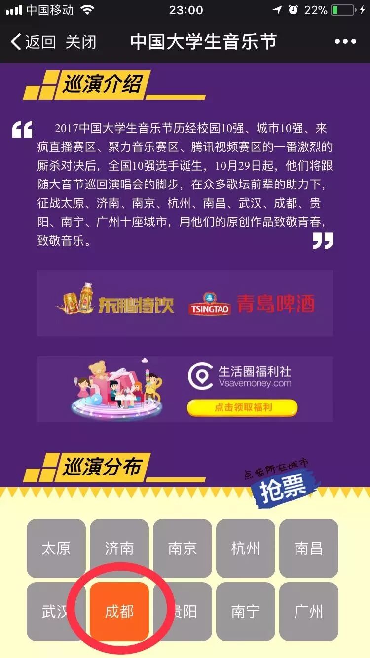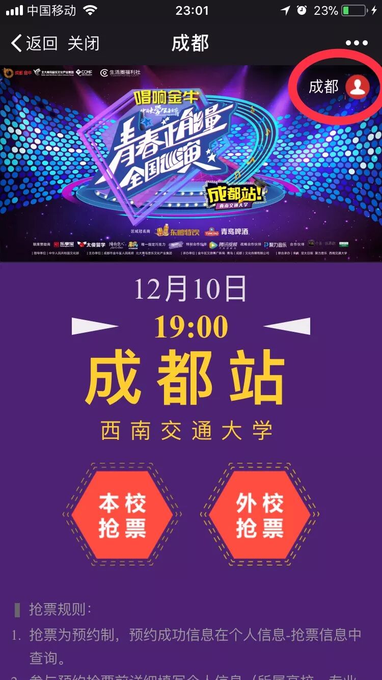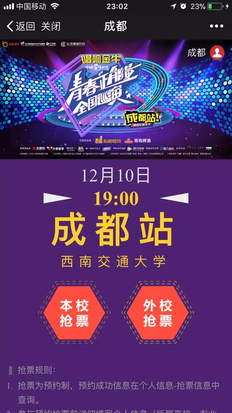 4、 抢票成功请第一时间凭系统发放的票务码,个人微信关注“生活圈优惠券”公众号证明及学生证于2017年12月10日11:00-17:00到西南交通大学九里校区篮球场大音节巡演嘉年华现场领取。