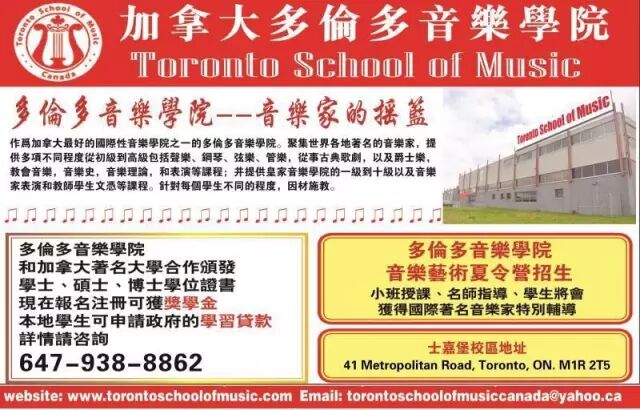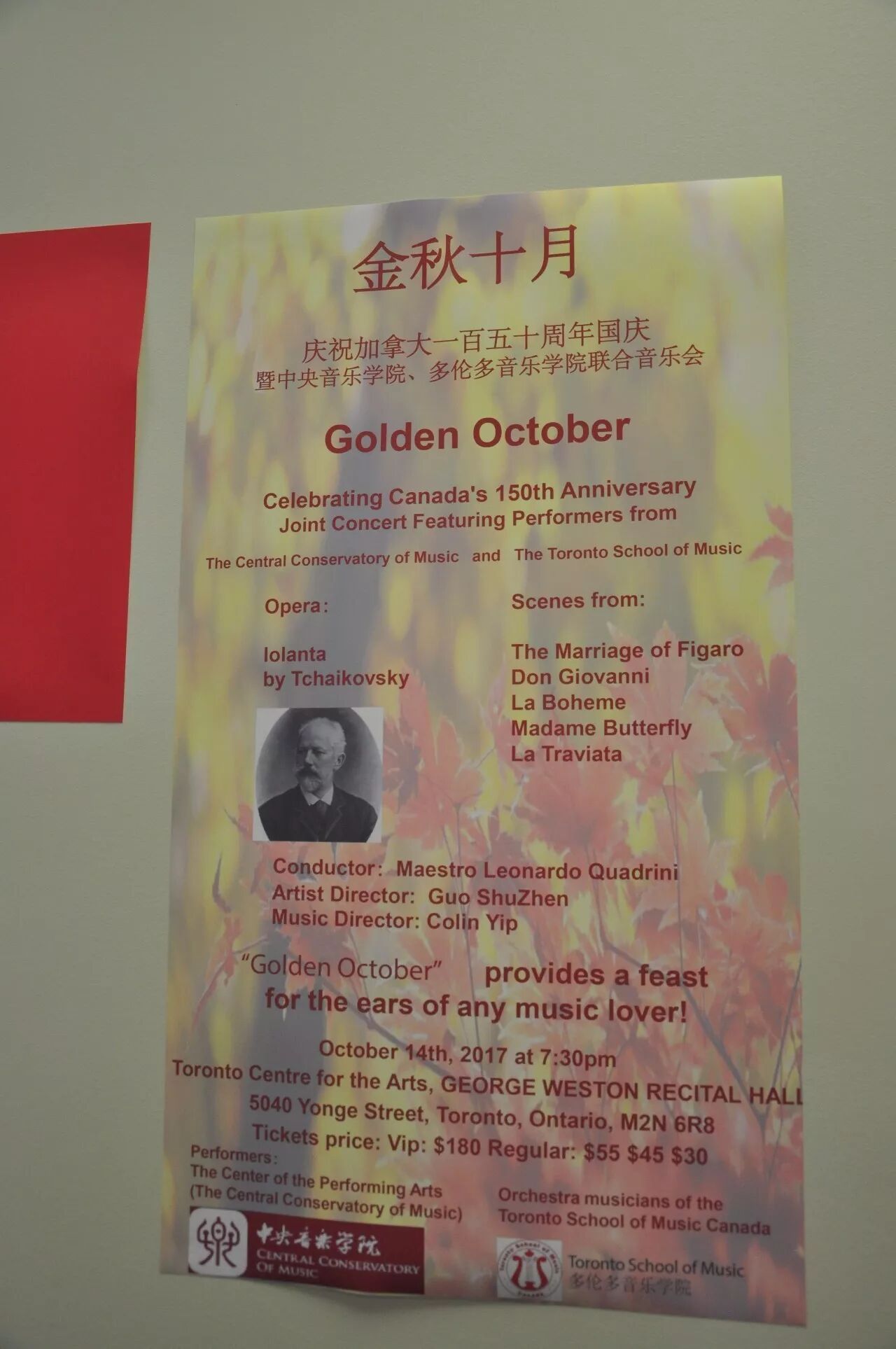 据了解,这次音乐节还将包括十月十四日晚上七点半在北约克多伦多艺术中心音乐厅(Toronto Centre For The Art)举办 “金秋十月” —— 北京中央音乐学院与多伦多音乐学院管弦乐团歌剧音乐会。十月十三日下午两点在加拿大多伦多音乐学院举行的“新丝路” 国际音乐比赛暨中外民族声乐展。以及十月十三日晚上八点在加拿大广播电台音乐厅(CBC GlenGould Studio)举办的 “中国优秀音乐家系列” 音乐会。