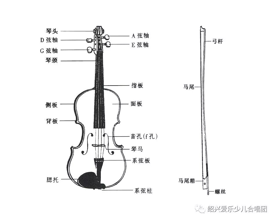 小提琴整个乐器为木质结构。包括琴头、琴颈、琴身、琴弓和配件等部分组成,在每个部分中又包括若干零件(见图)。