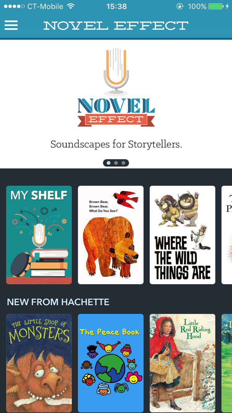 首先打开 Novel Effect,并在系统设置内打开麦克风,你会看到 app 中书架上放满了有趣的故事书。