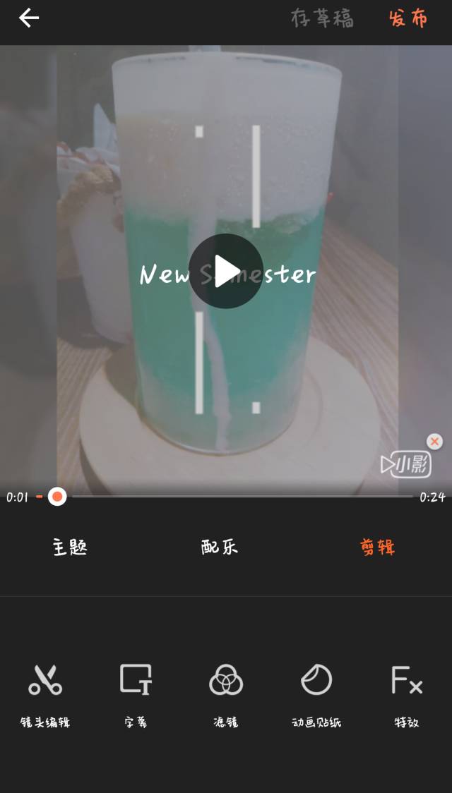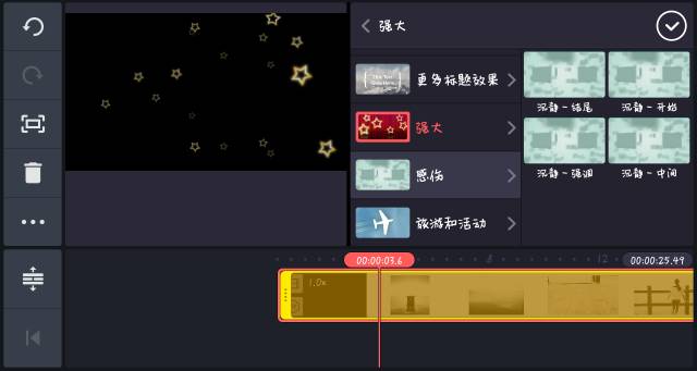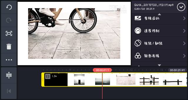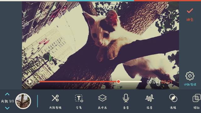 特效稍显浮夸,不太适合小清新的片子,比较适合搞笑的、日常的片子。镜头编辑功能里面又分有8个小功能,值得一提的是它有倒放镜头的功能,稍微不足的是,每一个分镜头里不能指定一个片段进行倒放。
