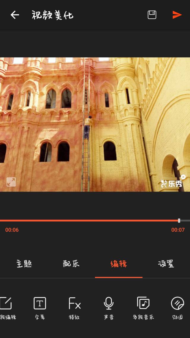 剪辑页面,还算比较简洁,一共有四大功能区:主题、配乐、编辑、设置。乐秀的主题相对FilmoraGo的主题更简洁些,有的只是有些简单的转场,并不像FilmoraGo的主题那样有很多炫酷的特效。编辑里面的小功能也蛮多的,丝毫不输FilmoraGo,但相比于后者它有配音功能但没有混音功能,独特之处在于它可以进行涂鸦。