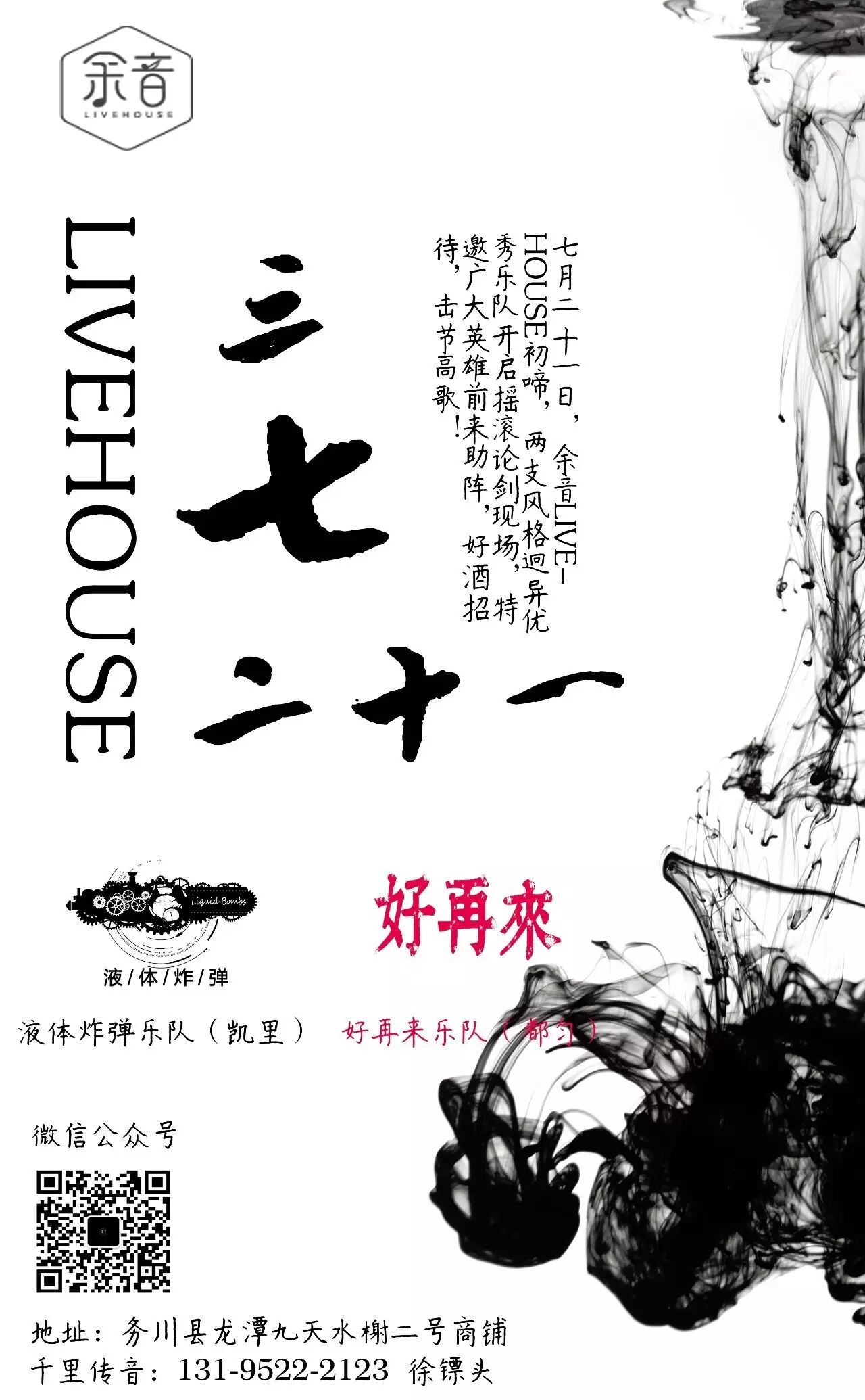 还不够!7月21日,我们将请到贵州省极有实力与名气的好再来乐队,开启周末狂欢大Party!乐队详情请关注我们的微信公众号查看,同时,我们欢迎个人或团体来余音展示优秀的才艺,演出/设备租赁联系方式等也在我们的公众微信号。