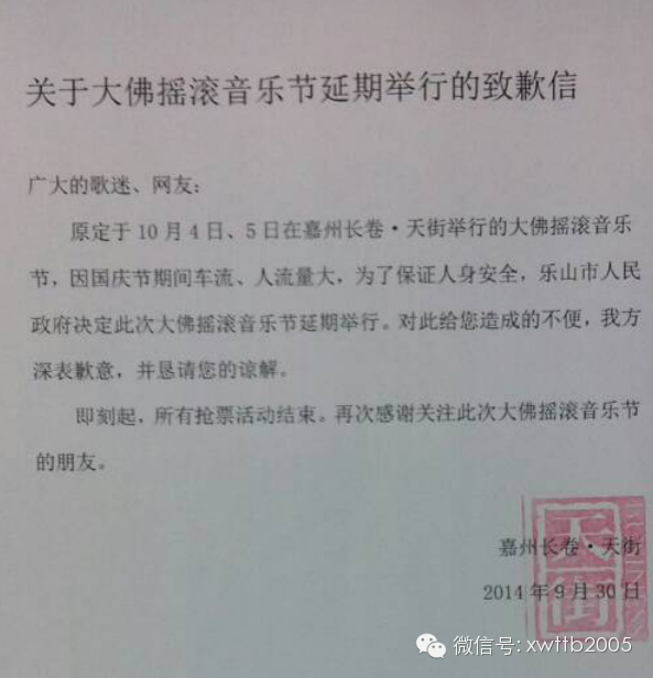 原定于10月4日、5日在嘉州长卷·天街举行的大佛摇滚音乐节,因国庆节期间车流、人流量大,为了保证人身安全,乐山市人民政府决定此次大佛摇滚音乐节延期举行。对此给您造成的不便,我方深表歉意,并恳请您的谅解。