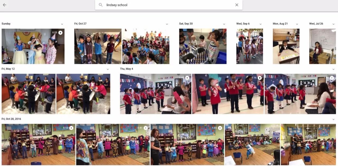 这下子,搜索照片可以按名搜索,再加上照片本身含有的地理位置,可以名字+地点缩小搜索范围,解决 80% 的搜索需求。比如说我想找小宝在学校的照片,输入 lindsey school,几万张照片里,相关的照片一下子就出来了,相当给力。