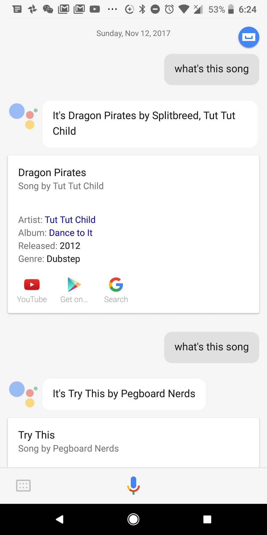 说完了照片,我们再谈谈声音。如果说相机是 2XL 的眼睛,用来发现和理解看到的一切;那么麦克风就是 2XL 的耳朵,用来发现和理解听到的一切。多少次当我们在商场里邂逅一首动听的曲子,想据为己有却不得门径,那种 “求不得” 的状态真是急煞人也。现在好了,我们只需一捏手中的 2XL,google 助手就会跳将出来,等待主人的召唤。不必废话,直接问:“what’s this song”,安安静静听一会,google 助手就会告诉你音乐的名字,以及如何获得: