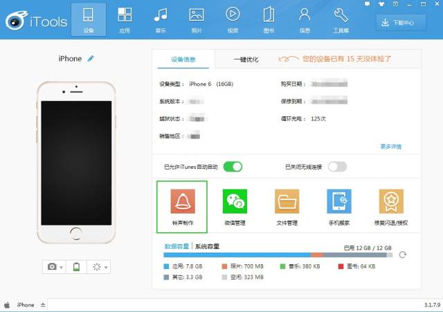第二步: 打开iTools,并将iPhone与电脑连接,连接成功。如下图所示,点击 制作铃声 按钮。