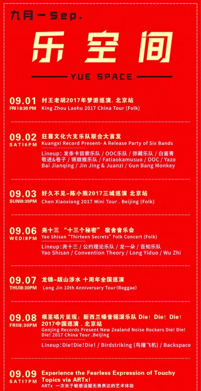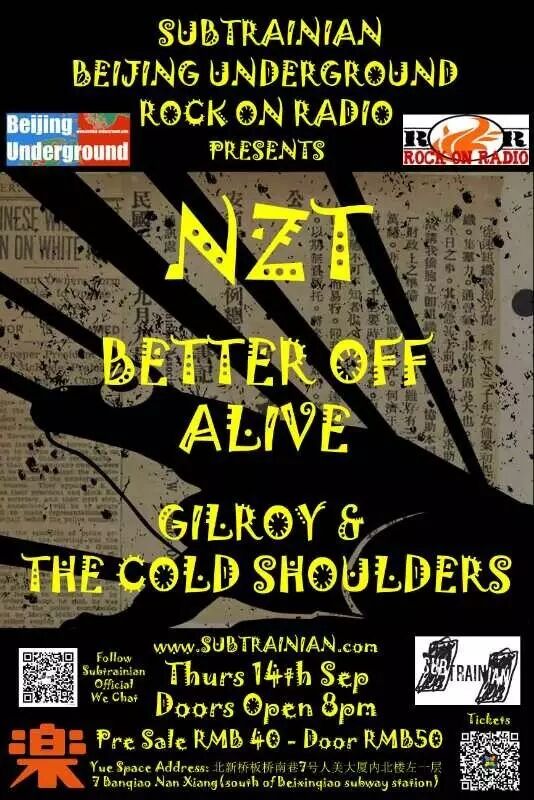 (北京地下) team up with 3 bands based on Beijing :NZT ,Better Off Alive,Gilroy and the Cold Shoulders to diliver a wild rock night @ YueSpace on Thursday 14 September 2017.