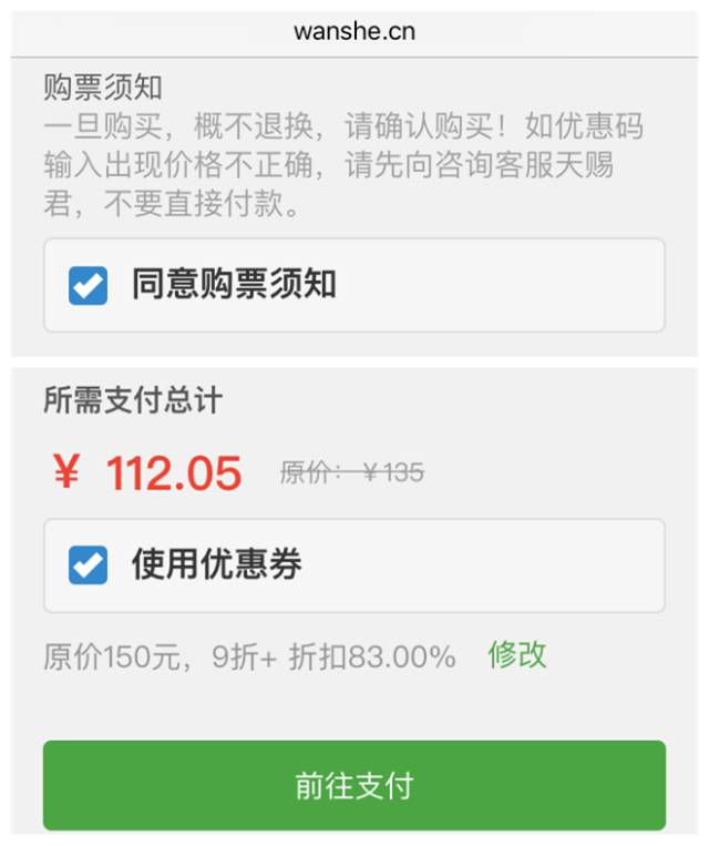 注意 注意: 如在购票过程中优惠码输入出现问题,价格不正确,请先向客服天赐君(微信号:tc37618286)咨询,不要直接付款。门票一经购买不退不换!