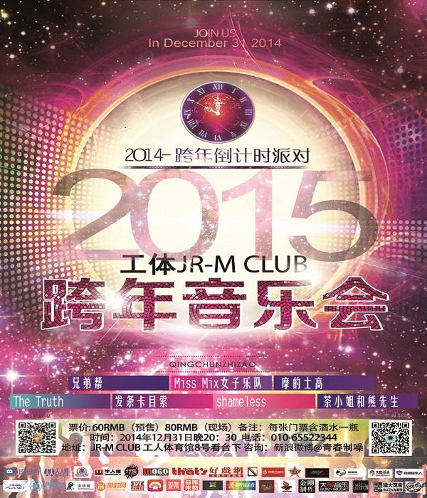 参与乐队阵容:Cassette记忆暗盒乐队/隔壁团/ Monster KaR /Snapline /花伦 /浪/ DJ Design(刘伟LiUWEi)4工体JR-M CLUB青春制造 跨年音乐会