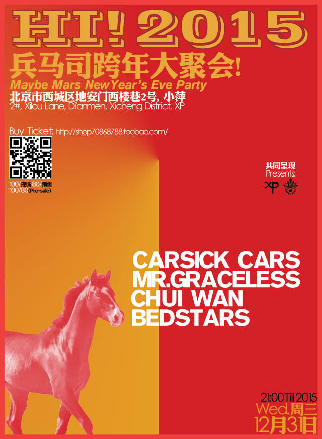 活动详情:和兵马司唱片、XP俱乐部、Carsick Cars、Mr.Graceless、Chui Wan、Bedstars,各路新老朋友们一起迎接新的一年吧!