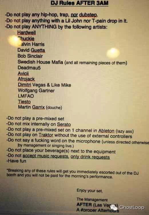 賭城真的在改變嗎?「After」是位在賭城Tommy Wind Theatre,於二月一號開始營業的舞廳。這家舞廳如同其名主打續趴,營業時間是在其他舞廳準備休息的時間。為了吸引音樂上癮趴不夠的核心族群,他們主打地下類型音樂。該舞廳的管理夥伴Thom Svast並為此直接訂下嚴格的規定,要求來此放歌的DJ照辦。這張照片就是「After」對DJ的要求:-不可放嘻哈、Trap與Dubstep