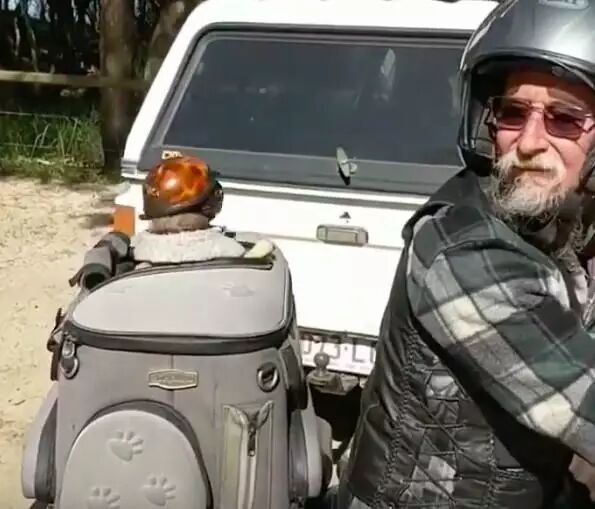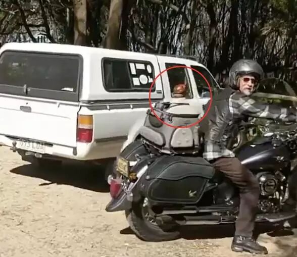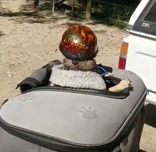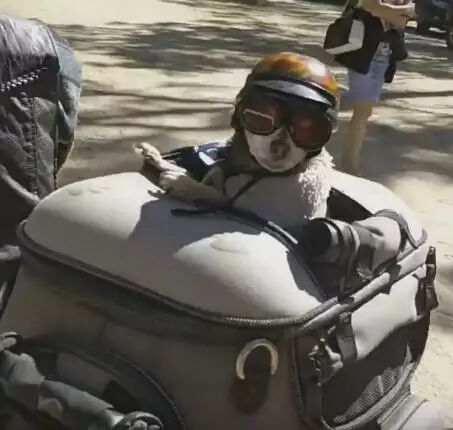 网友在美国停车场看见摩托车后面疑似有个戴头盔的小家伙,于是好奇的走过去,靠近时看到这孩子头戴安全帽还穿了衣服,主人像是带着宠物一起要旅行!