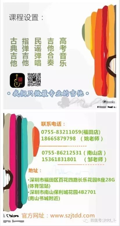 深圳吉他地带,是深圳专业做吉他培训及高端吉他销售的机构。这里拥有丰富的教师资源,科学的教学系统。本艺术中心所有聘用的老师均为毕业于全国著名音乐院校,拥有丰富的教学经验,为确保教学质量,以耐心和真诚为教学态度,并把因材施教作为教学理念。 深圳吉他地带秉持着一种专业只做吉他教学的理念,让学员们更加专业的学习吉他艺术。并让学员在学习吉他中有多种类型的选择方向,比如:古典吉他、古典吉他合奏、民谣弹唱、指弹吉他、花式炫技吉他、尤克里里等。