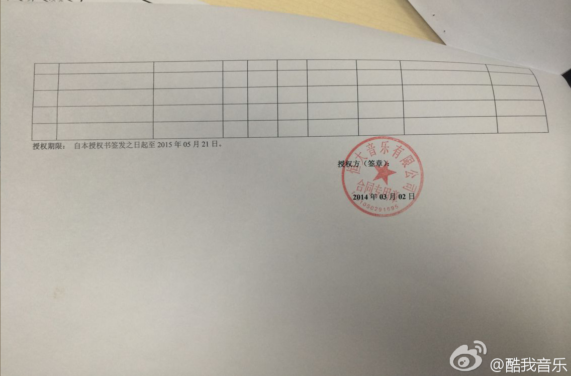 1月6日中午,沉默多日的酷我音乐终于表态,表示在收到苏阳12月25日的微博后,酷我音乐第一时间与苏阳团队进行沟通,保留拥有版权的音乐作品,将客户端头像更换正确,尽其所能表示出对苏阳音乐作品的尊重和对其本人的重视,并且公布了”酷我音乐版权证明材料“。然而,授权书字迹渺小,从图片中根本无法辨认内容,合同落款签章处也并非是苏阳所在的音乐公司”十三月音乐独立厂牌“。