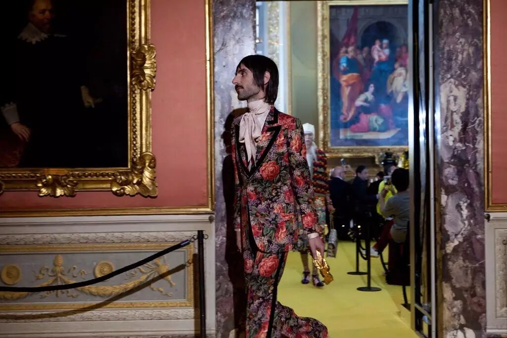 而对于走秀模特的挑选,Alessandro Michele也亲自参与其中。他挑选的模特,许多都不是经常叱咤四大时装周的职业模特,而是来自不同行业的新面孔,为秀场注入新鲜血液。上个月月底的Gucci 2018度假系列时装秀也不例外。“这是一种文艺复兴时期的摇滚时尚感。”Alessandro Michele如是说,当嘉宾们穿越瓦萨利走廊来到彼提宫然后进入秀场,会立马感受到扑面而来的华丽时代感。