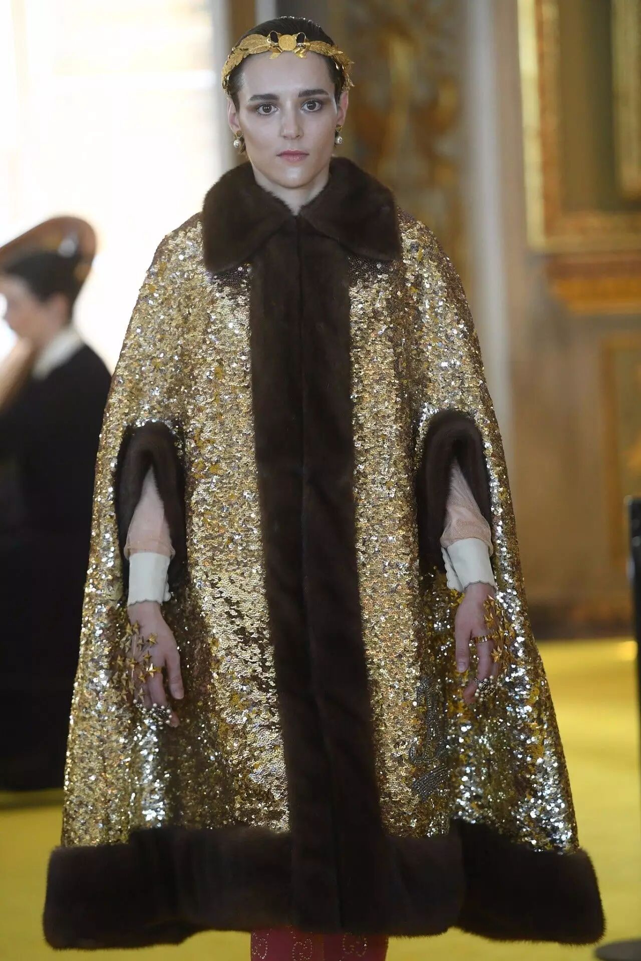 身高两米零六的Arun Roberts,比专业模特们还要高得多,走秀时还穿着Alessandro Michele设计的厚底皮鞋,天花板已经触手可得。Arun的络腮胡以及一头长卷发,宛如是复古油画中走出来的人物,简直可以和这场秀的主题融为一体。